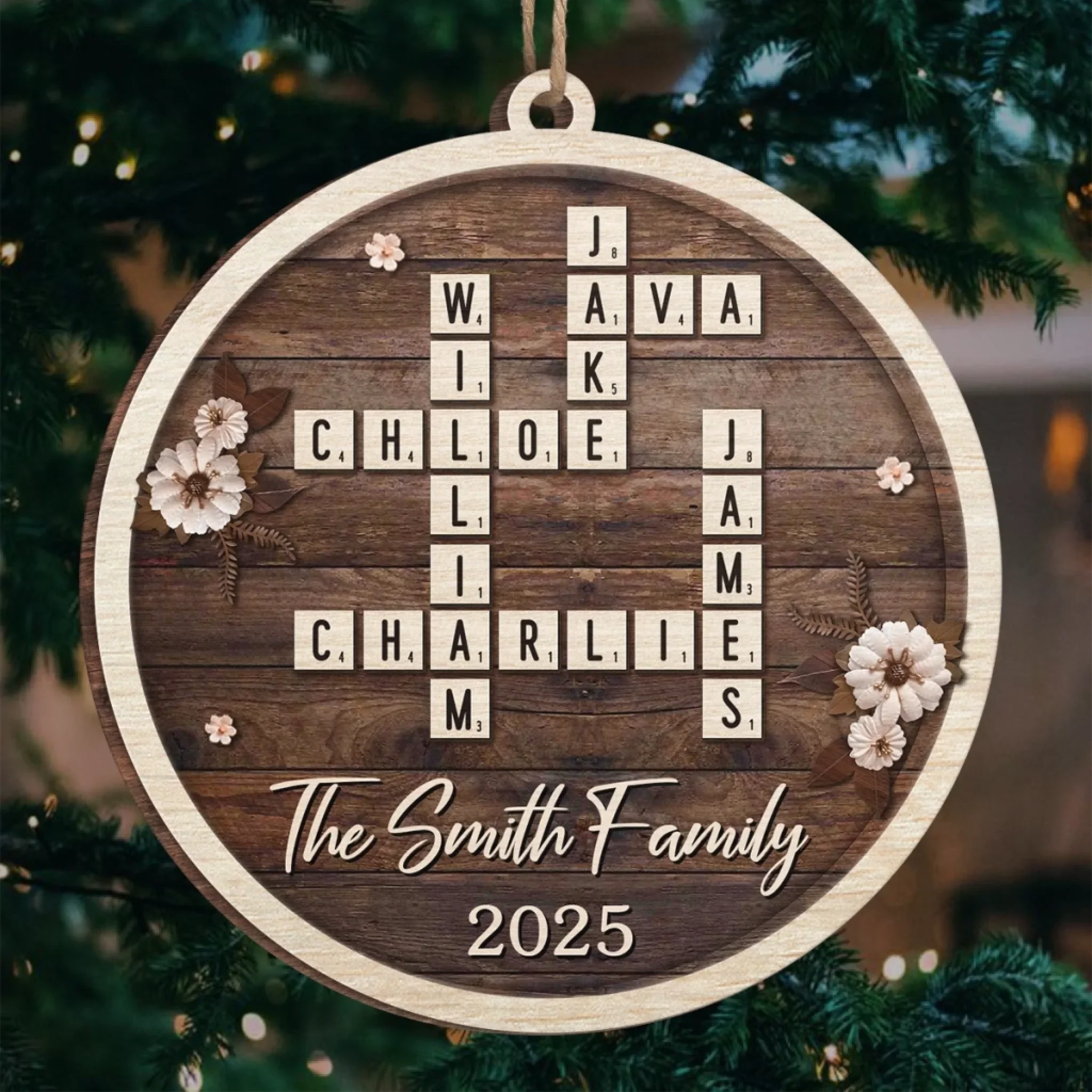 Custom Scrabble Wood Ornament - Personalized Christmas Birthday Gifts For Mom, Dad, Brother, Sister, Kids - Joy Gathers Around Our Tree