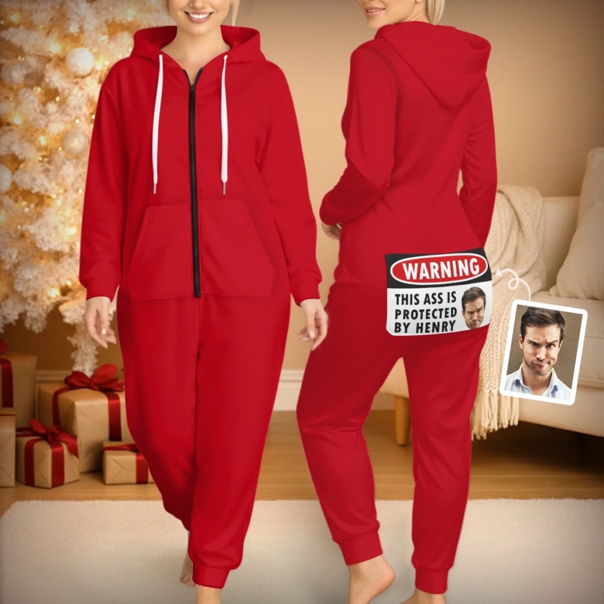 Custom Photo Adult Onesie Pajamas With Back Flap - Personalized Anniversary Christmas Wedding Gifts For Husband And Wife, Him And Her - This Love Has No Entry Zone