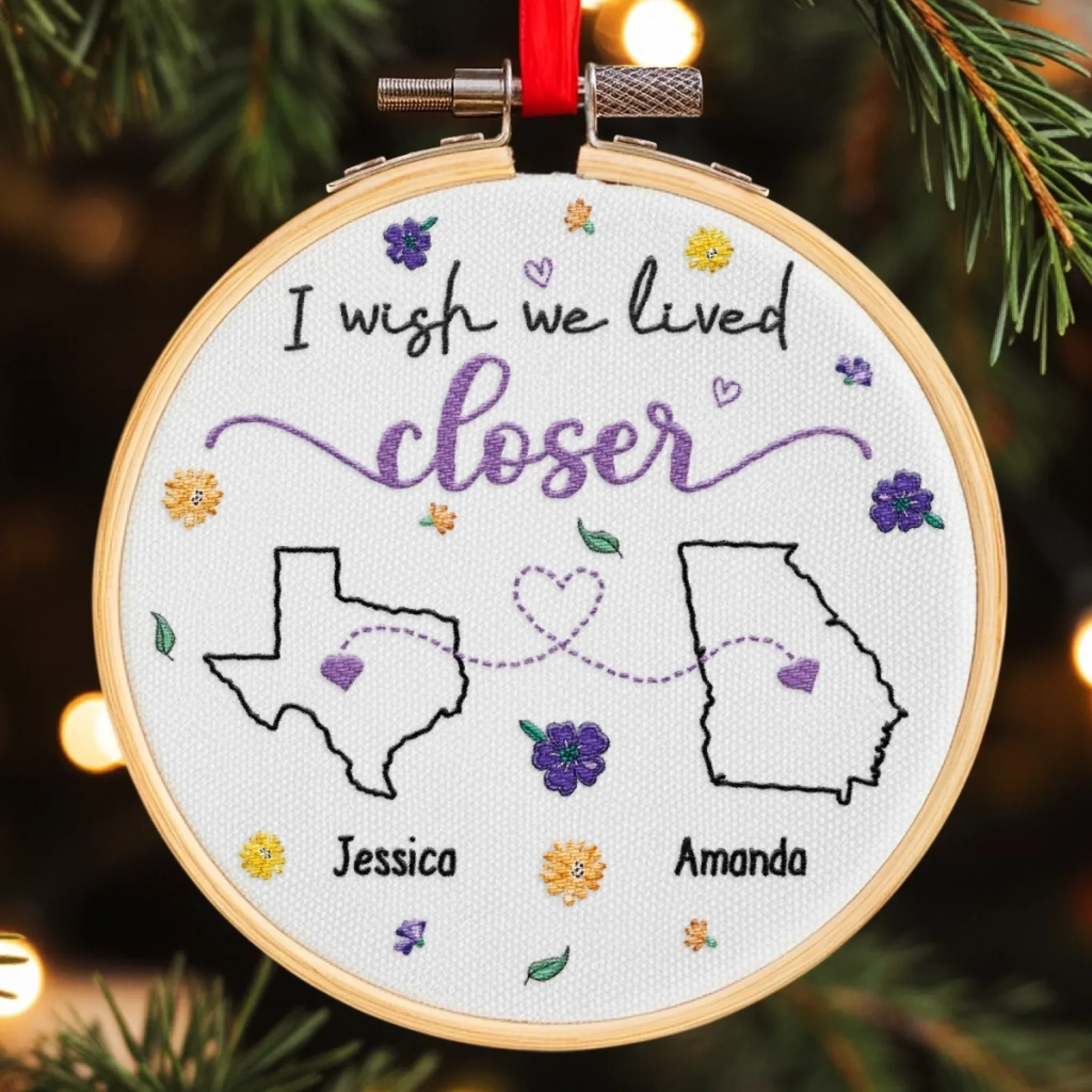 Custom Long Distance Embroidered Ornament - Personalized Best Friend Christmas Birthday Gifts For Women, Besties, Sisters, BFF - Hearts Connected Across The Miles