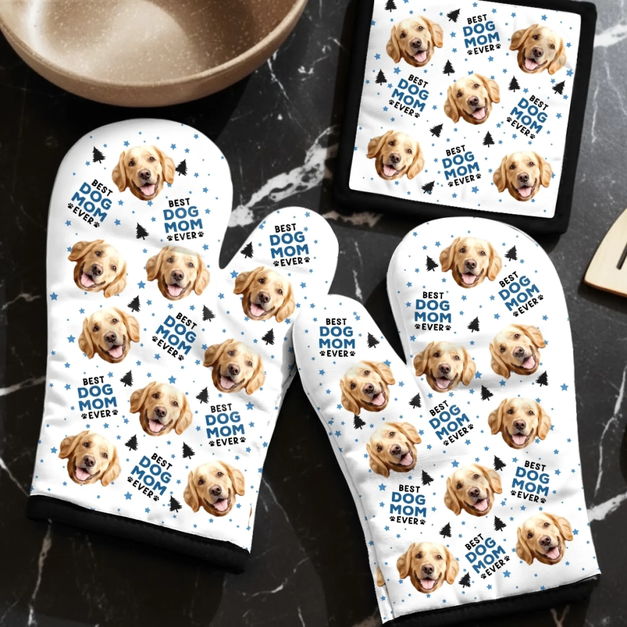 Custom Photo Oven Mitt And Pot Holder Set - Personalized Christmas Birthday Gifts For Mom, Grandma, Dog Cat Lovers - Best Fur Mom Ever