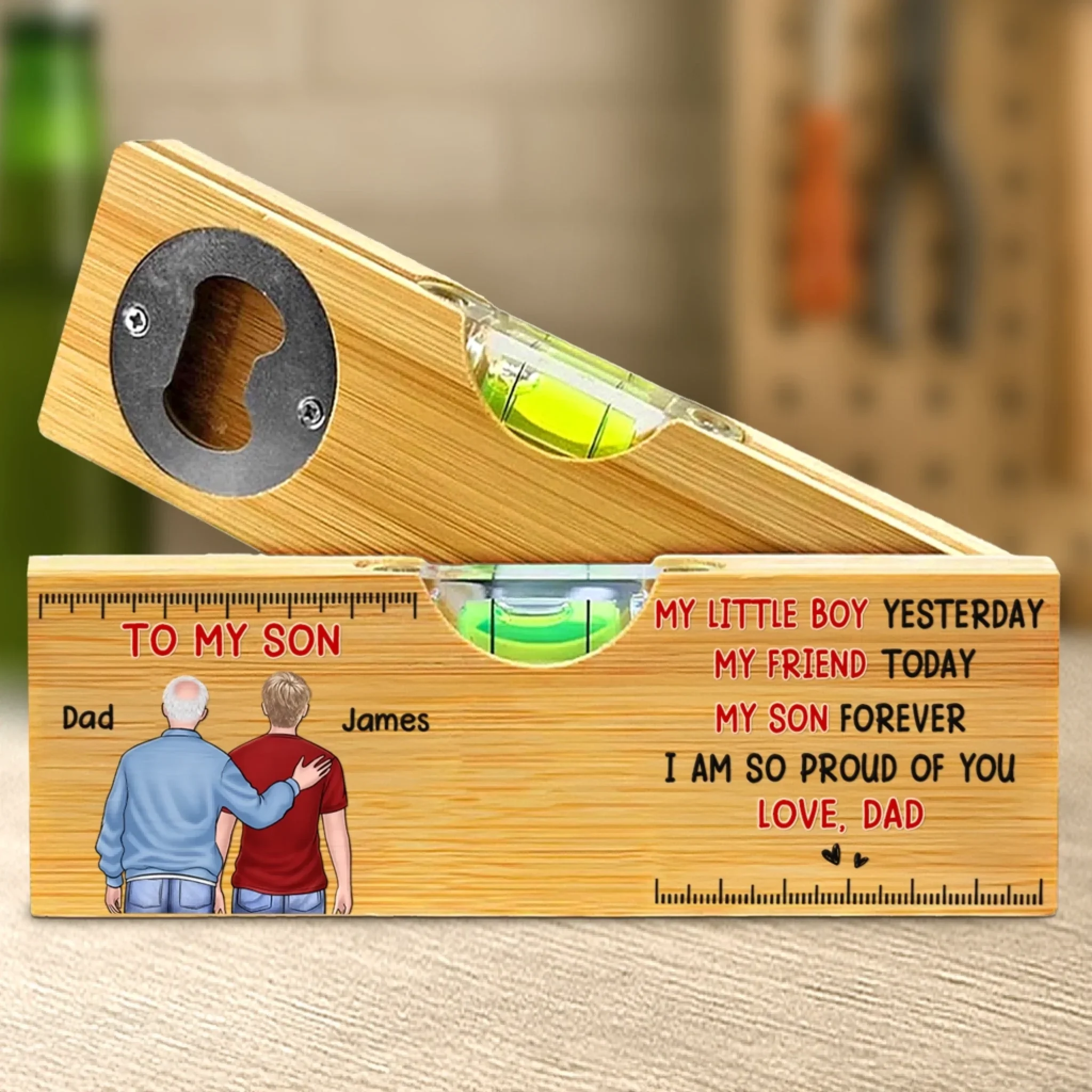 Custom Wooden Bottle Opener With Built-in Spirit Level - Personalized Birthday Gifts For Mom, Dad, Son - My Little Boy