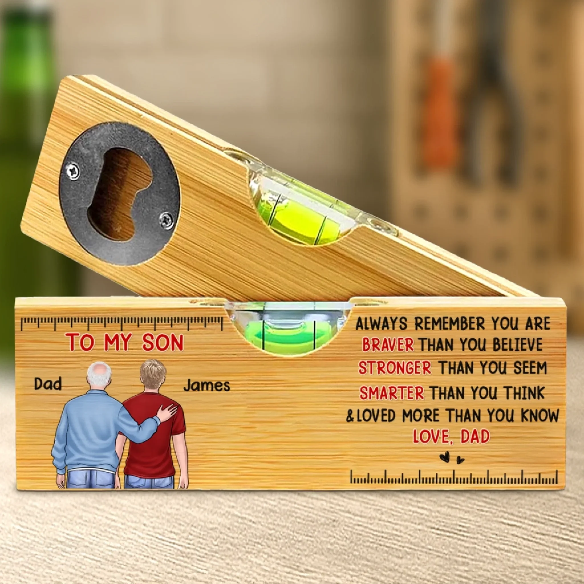 Custom Wooden Bottle Opener With Built-in Spirit Level - Personalized Birthday Gifts For Mom, Dad, Daughter, Son - Cheers To Us