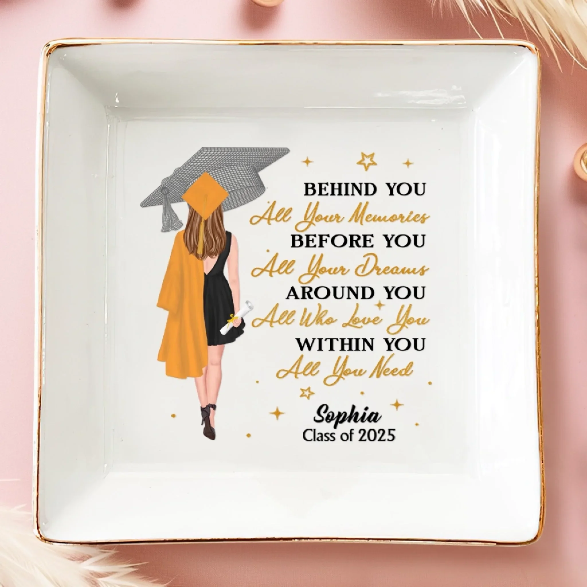 Started With A Dream, Ended With A Cap - Family Personalized Custom Jewelry Dish - Graduation Gift For Family Members, Siblings, Brothers, Sisters, Best Friends