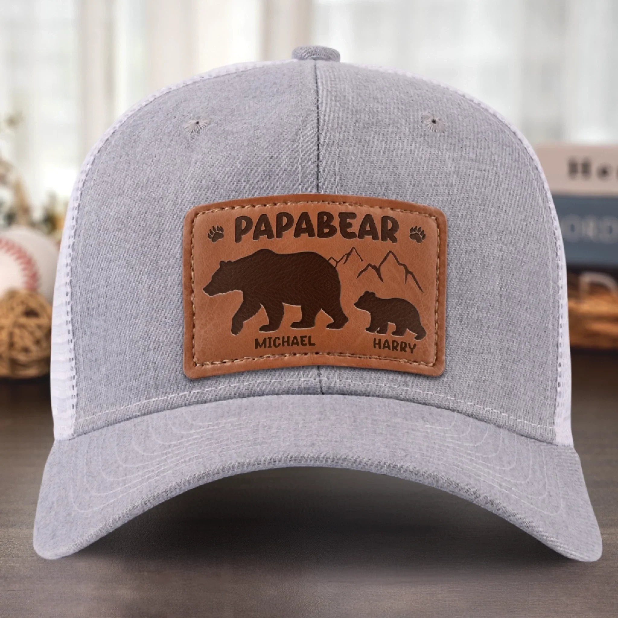 Papa Bear And His Cub - Family Personalized Custom Leather Patch Hat - Father's Day, Gift For Dad, Grandpa