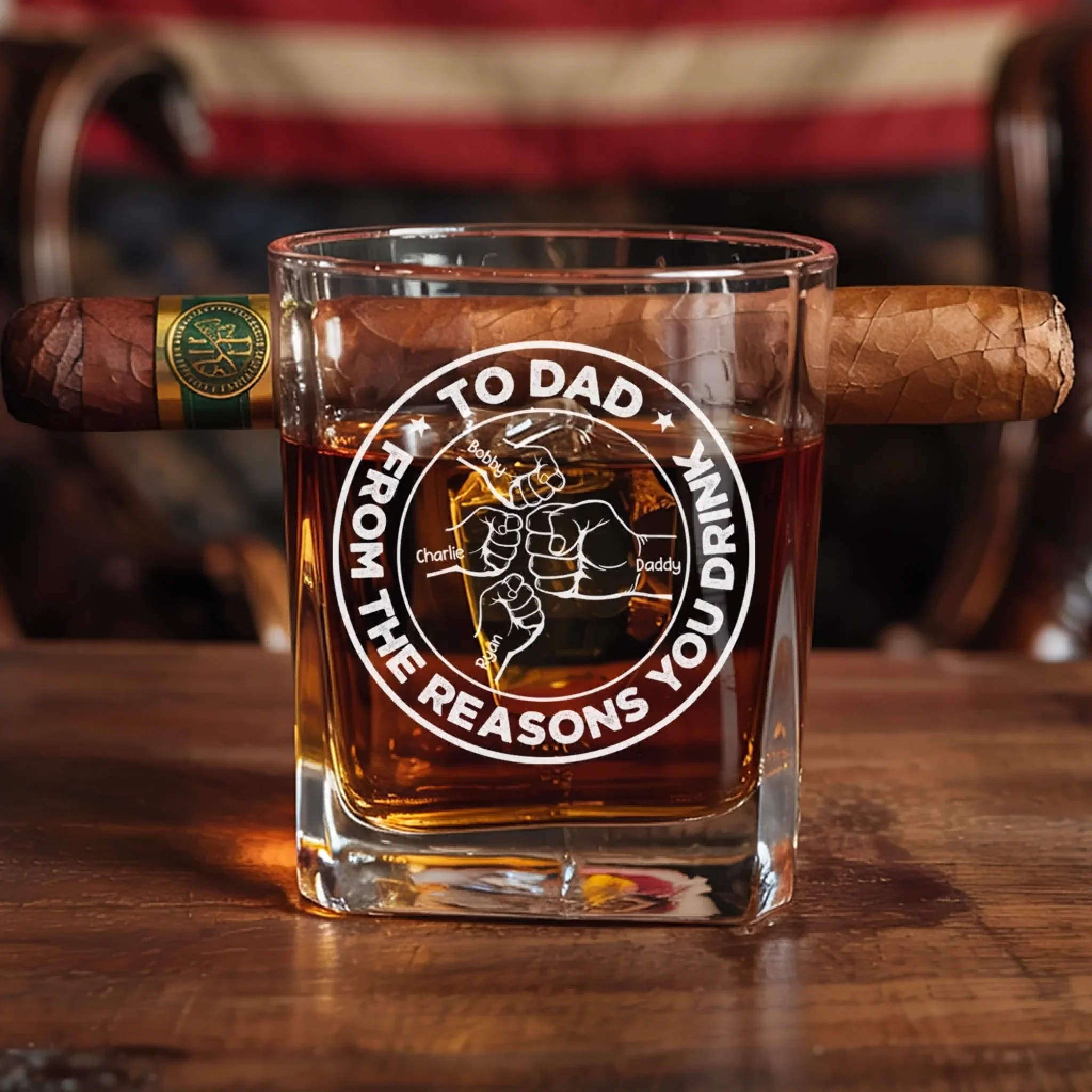 To Dad, From The Reasons You Drink - Family Personalized Custom Whiskey Glass With Cigarette Holder - Father's Day, Gift For Dad, Grandpa