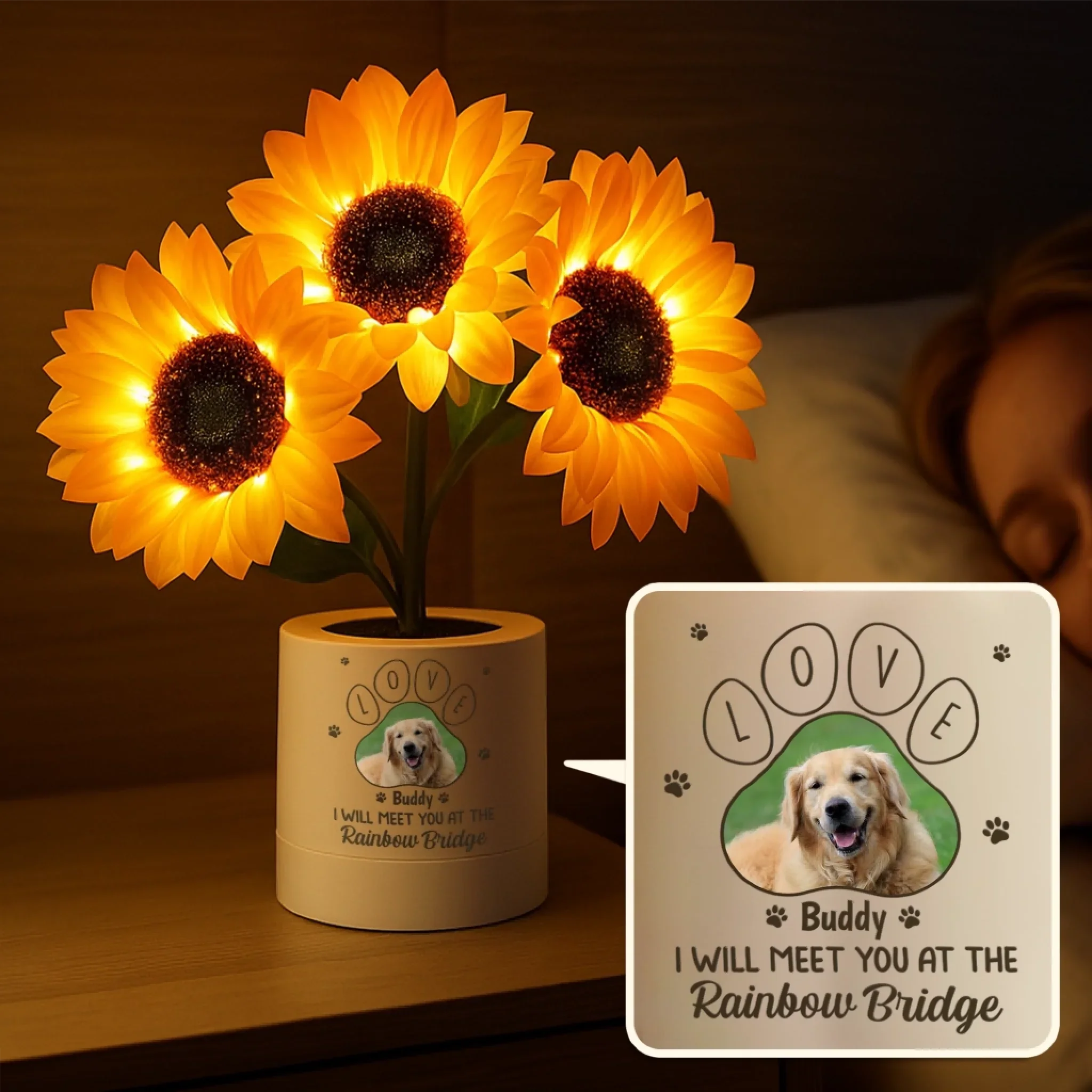 Custom Photo Sunflower Lamp Night Light - Personalized Pet Memorial Gifts For Dogs, Cats - I Will Meet You At The Rainbow Bridge