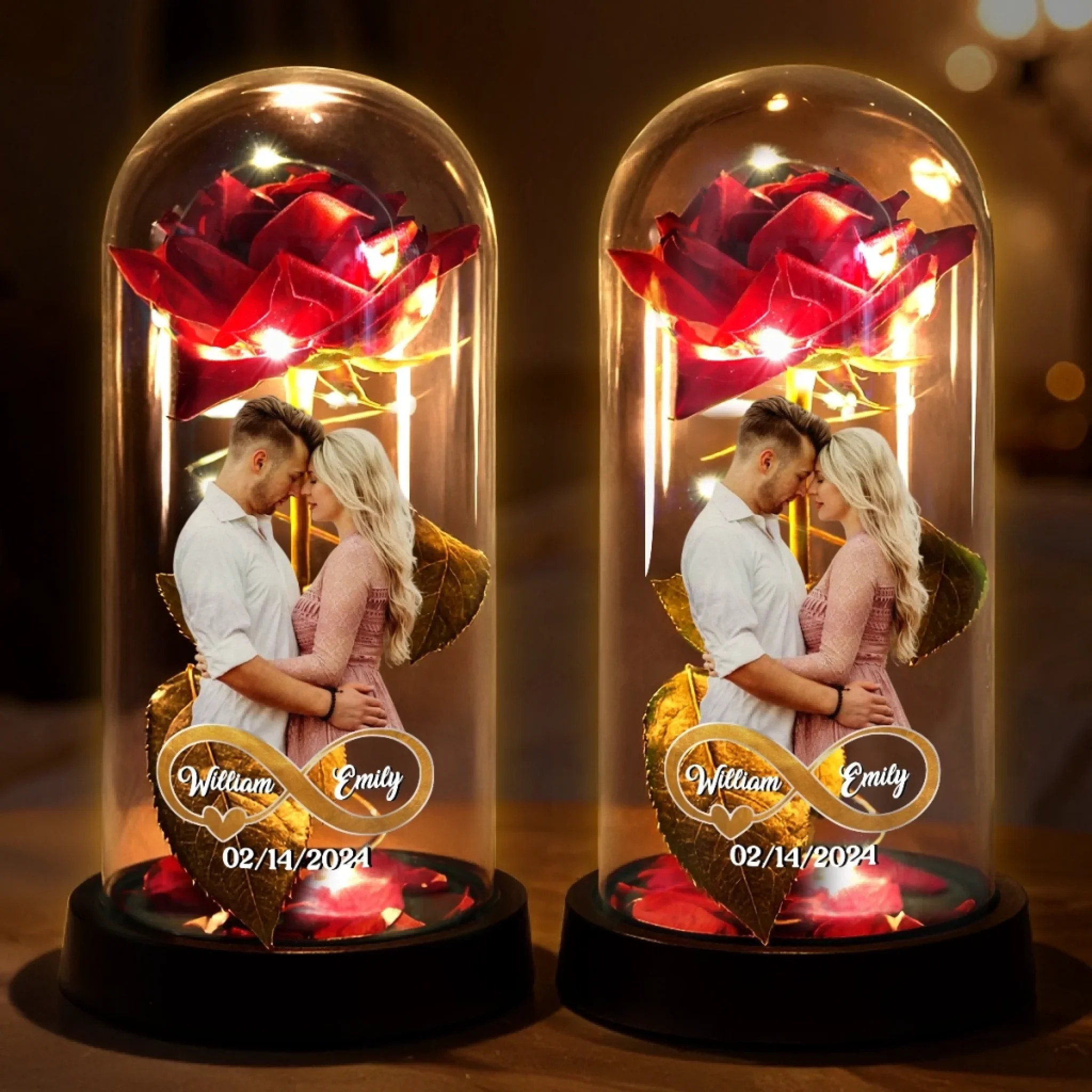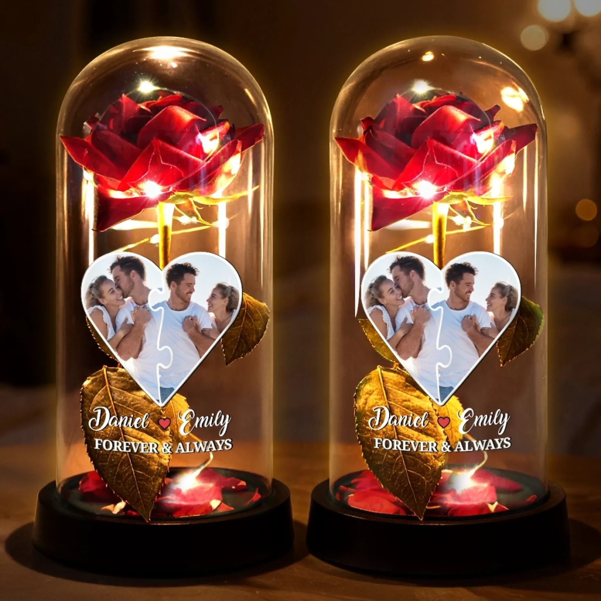 Custom Photo Light Up Eternal Rose In Glass Dome - Personalized Anniversary Wedding Gifts For Husband And Wife, Him And Her - Forever Yours, Forever Mine
