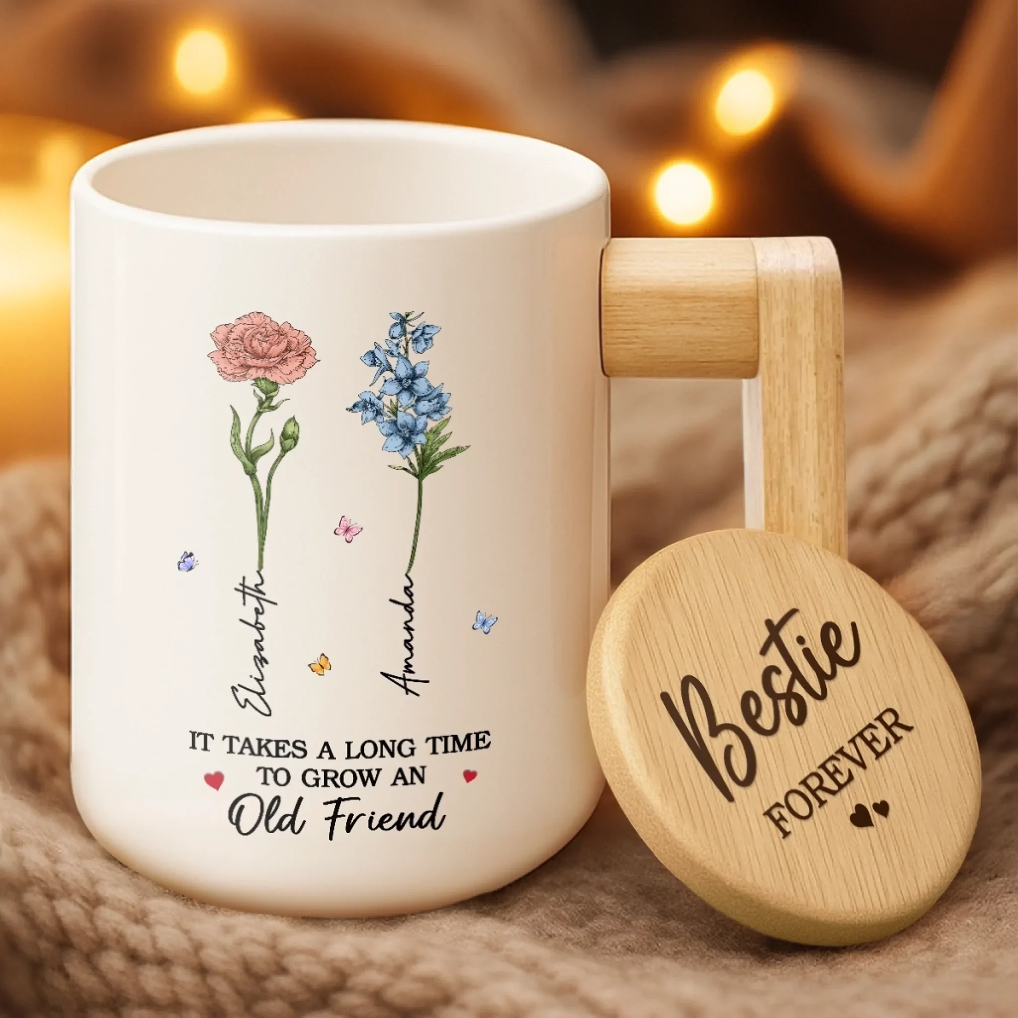Custom Ceramic Mug With Wooden Lid & Handle - Personalized Best Friend Birthday Gifts For Women - Friendship In Full Bloom