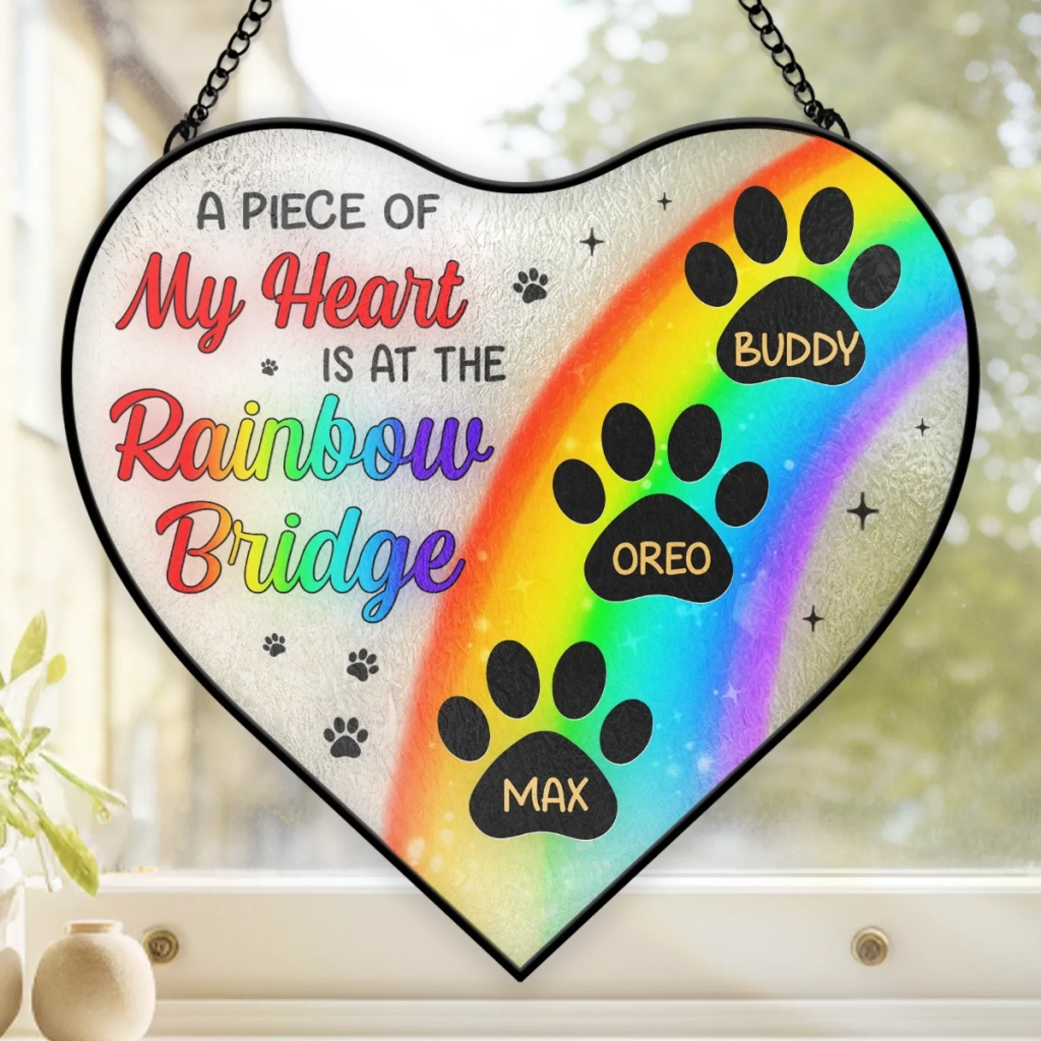 Custom Heart-Shaped Stained Glass Window Suncatcher - Personalized Pet Memorial Sympathy Gifts For Dogs, Cats - A Piece Of My Heart Is At The Rainbow Bridge