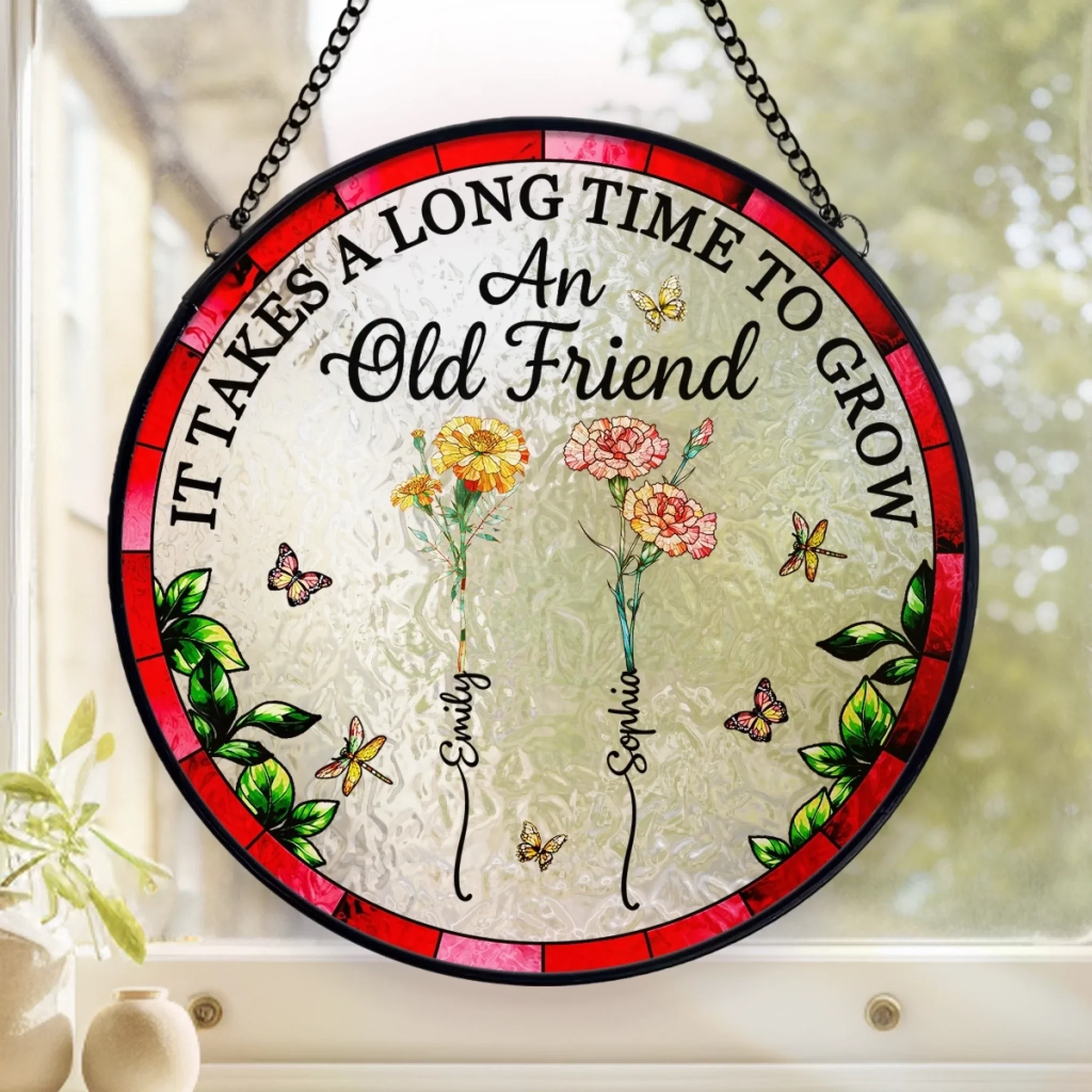 Custom Stained Glass Window Hanging Suncatcher - Personalized Best Friend Birthday Gifts For Women - Blooming Bonds That Last Forever