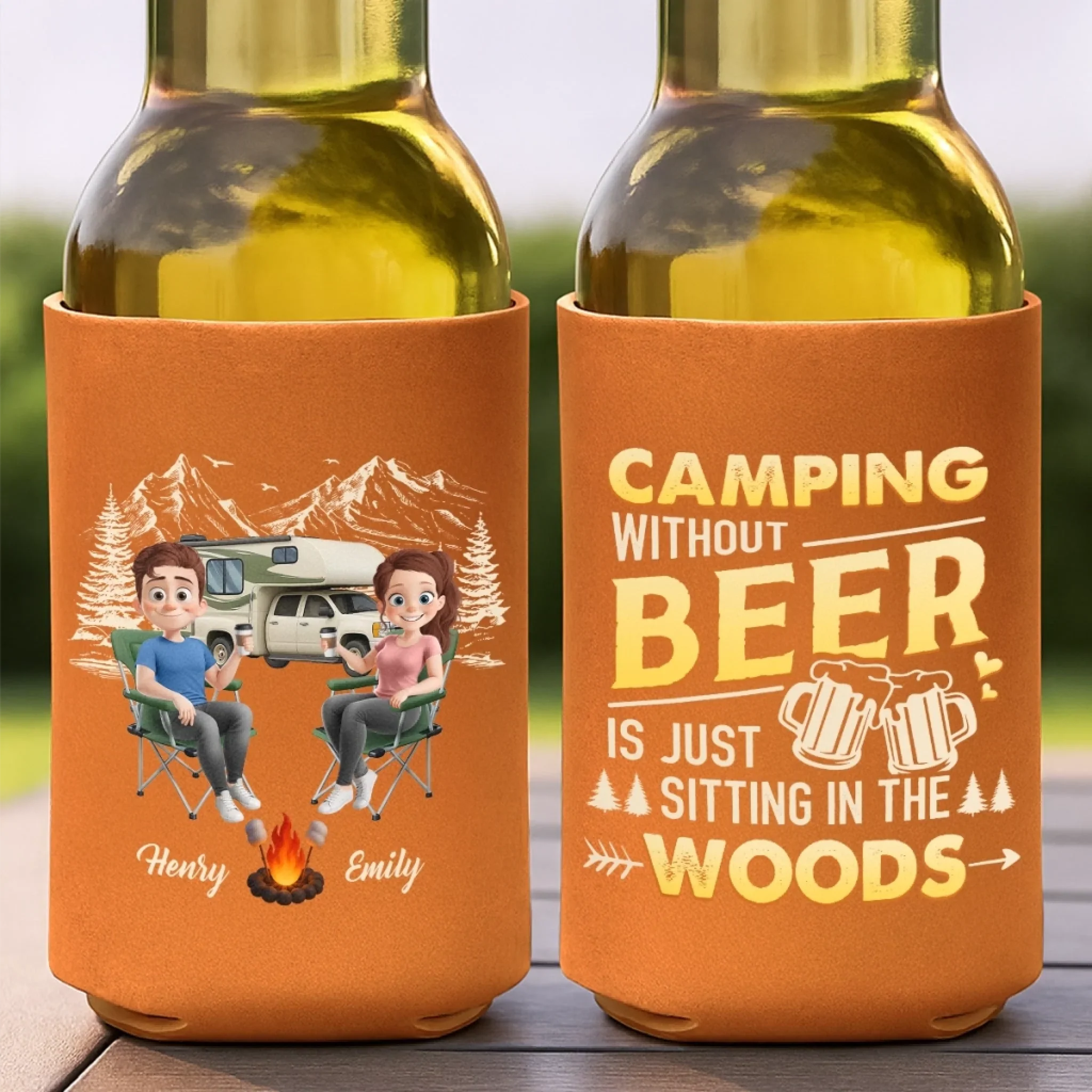 Custom Leather Can Cooler - Personalized Anniversary Wedding Gifts For Campers, Husband And Wife, Him And Her - Lost In The Woods, Found A Beer