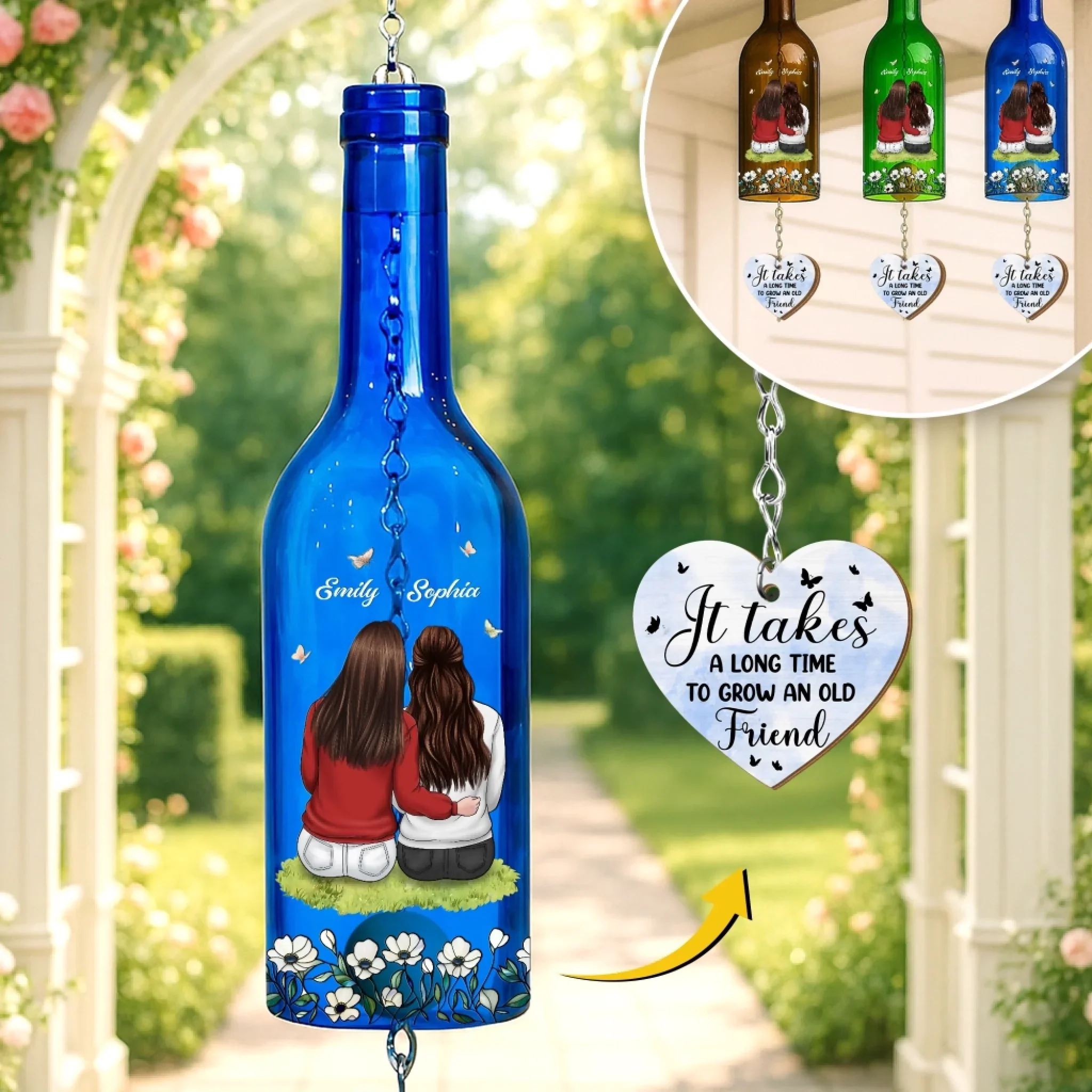 Custom Wine Bottle Wind Chime - Personalized Best Friend Birthday Gifts For Women, Besties, Sisters, BFF - Side By Side, Heart To Heart