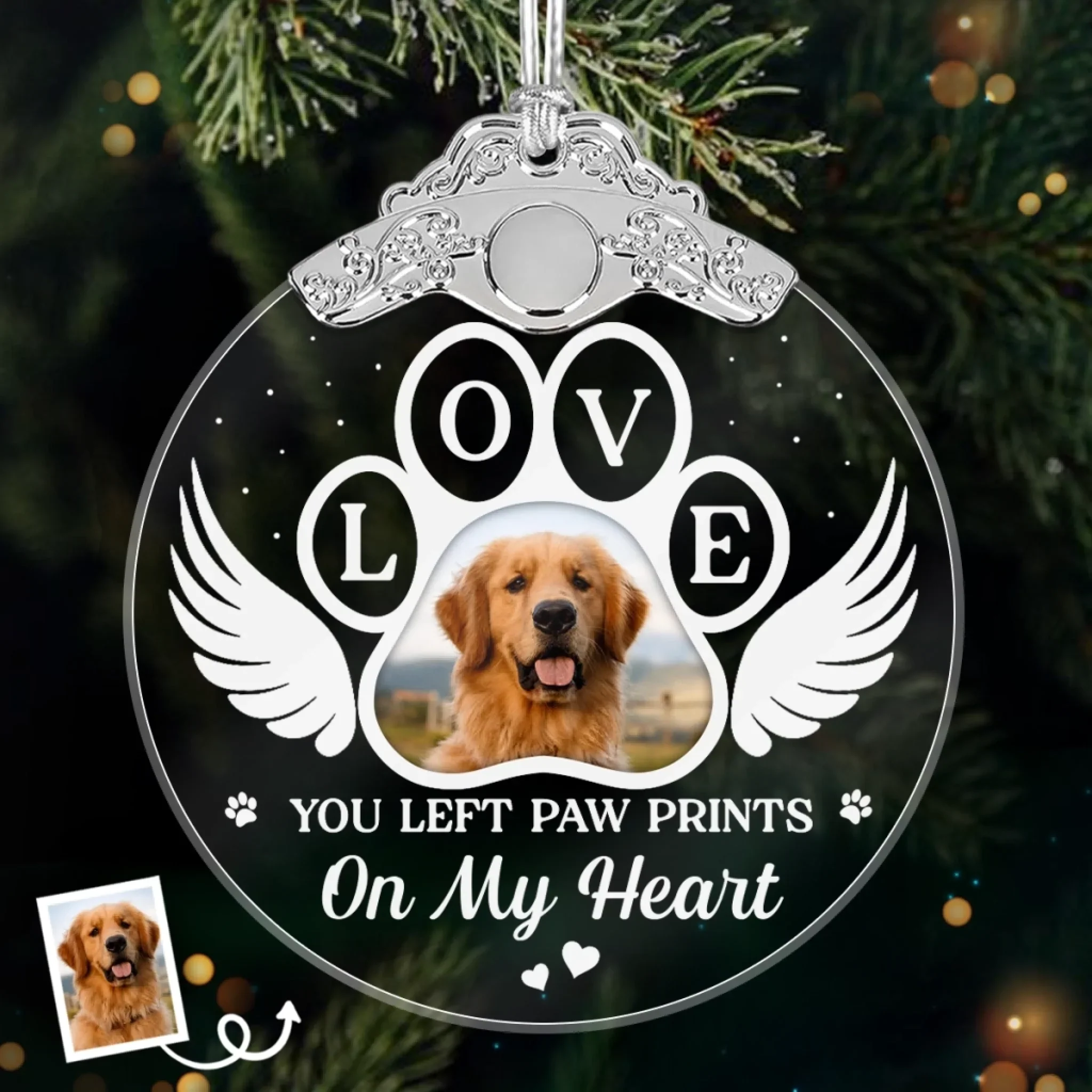 Custom Photo Glass Ornament - Personalized Pet Christmas Memorial Sympathy Gifts For Dogs, Cats - Paws Print Memories In Heart