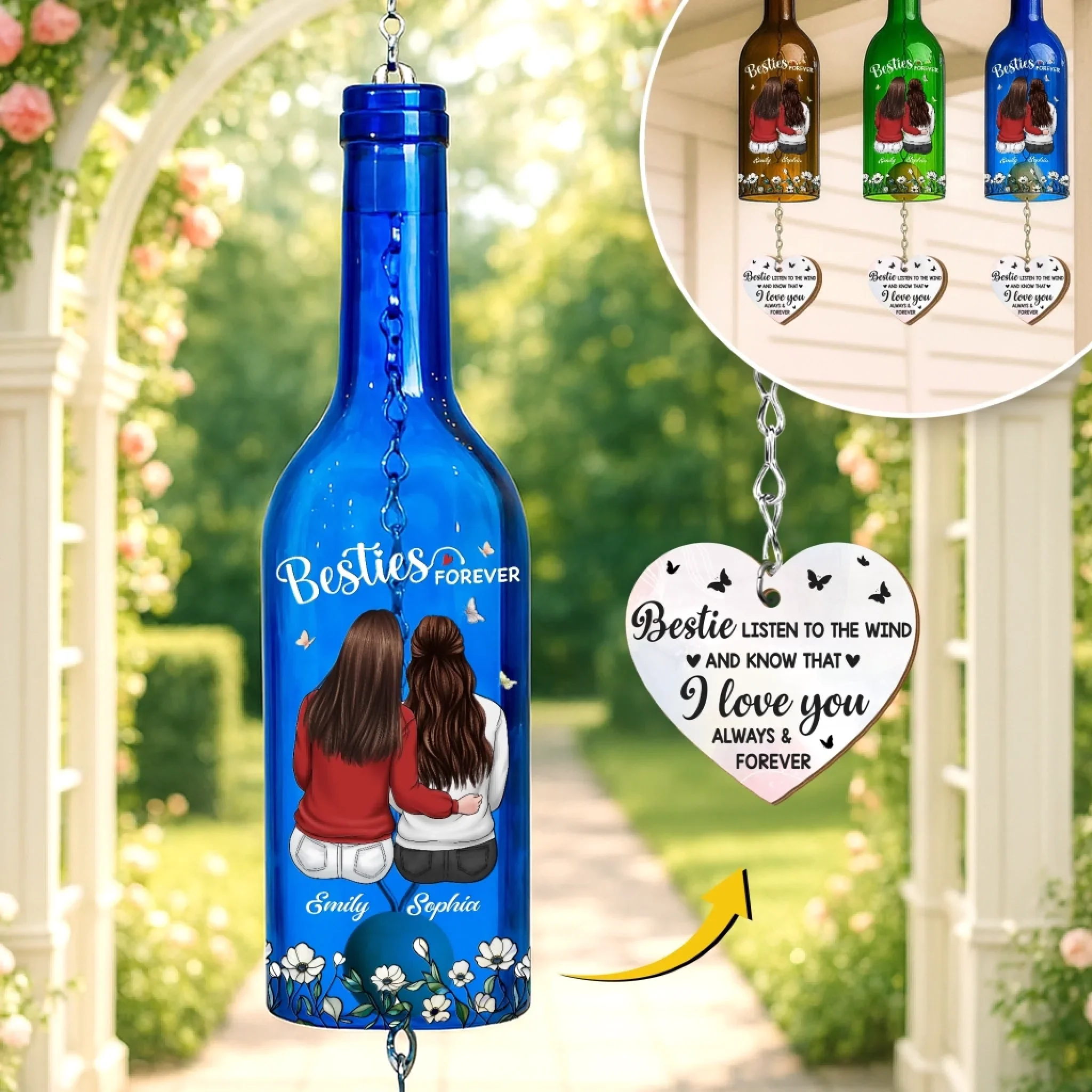 Custom Long Distance Wine Bottle Wind Chime - Personalized Best Friend Birthday Gifts For Women, Besties, Sisters, BFF - Always Besties