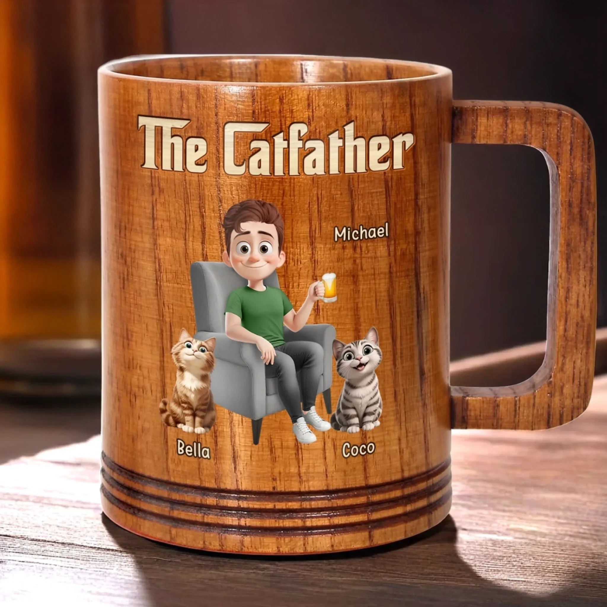 The Catfather, Chosen By My Cat - Cat Personalized Custom Wooden Mug - Father's Day, Gift For Dad, Pet Owners, Pet Lovers
