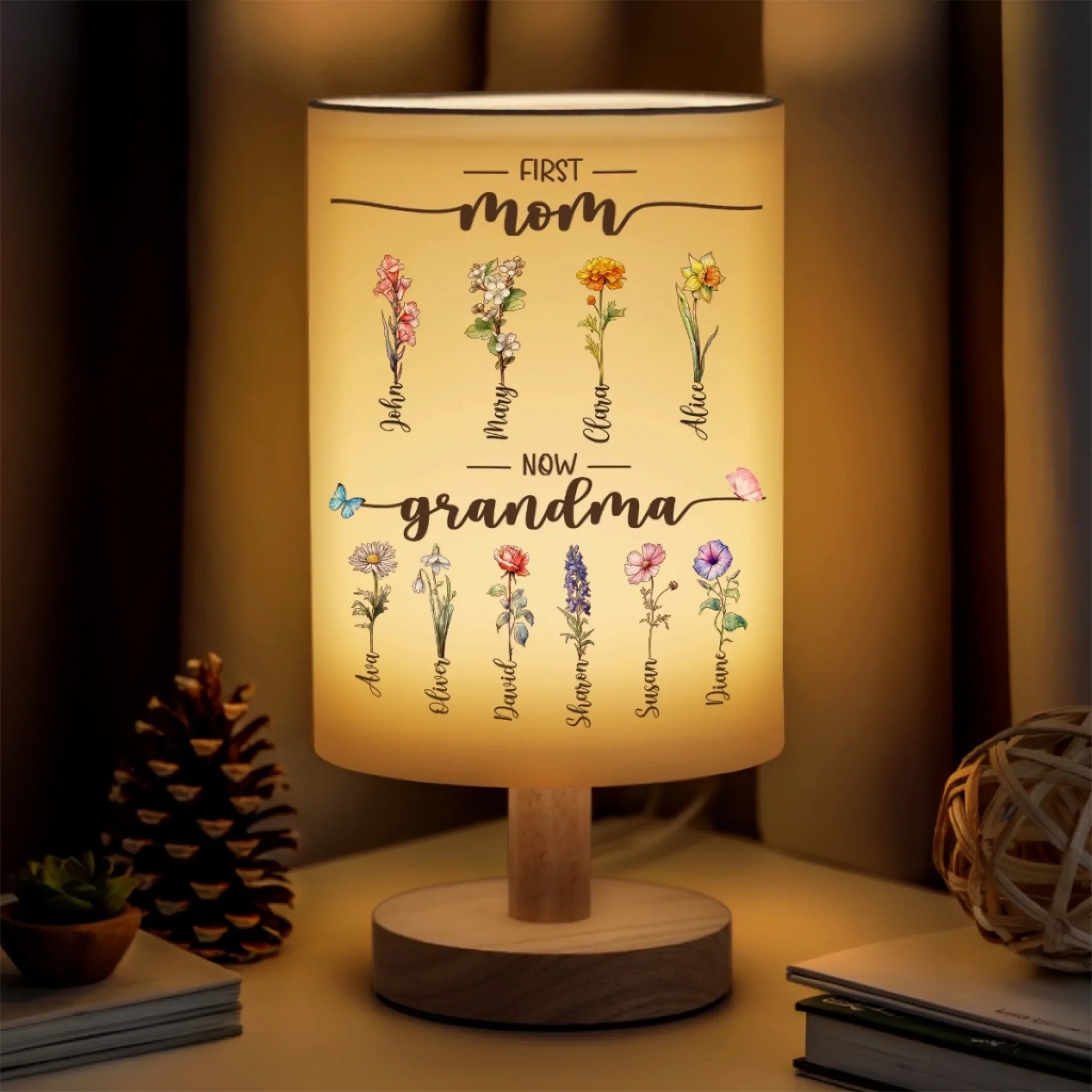 First Mom, Now Grandma - Family Personalized Custom Linen Bedside Table Lamp - Mother's Day, Gift For Mom, Grandma