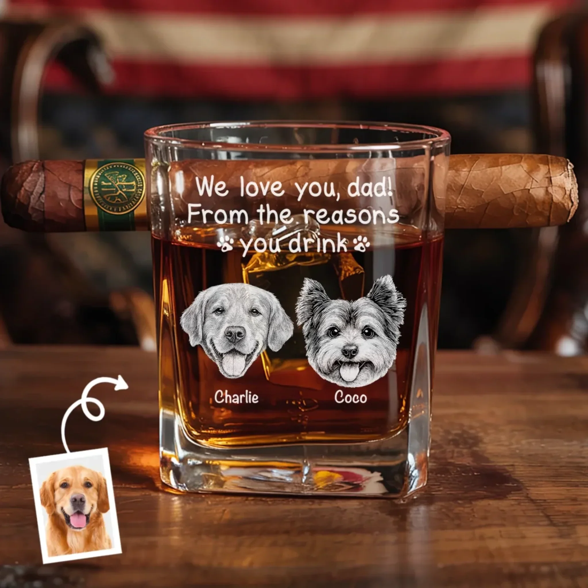 Custom Photo From The Reasons You Drink - Dog & Cat Personalized Custom Whiskey Glass With Cigarette Holder - Father's Day, Gift For Dad, Pet Owners, Pet Lovers