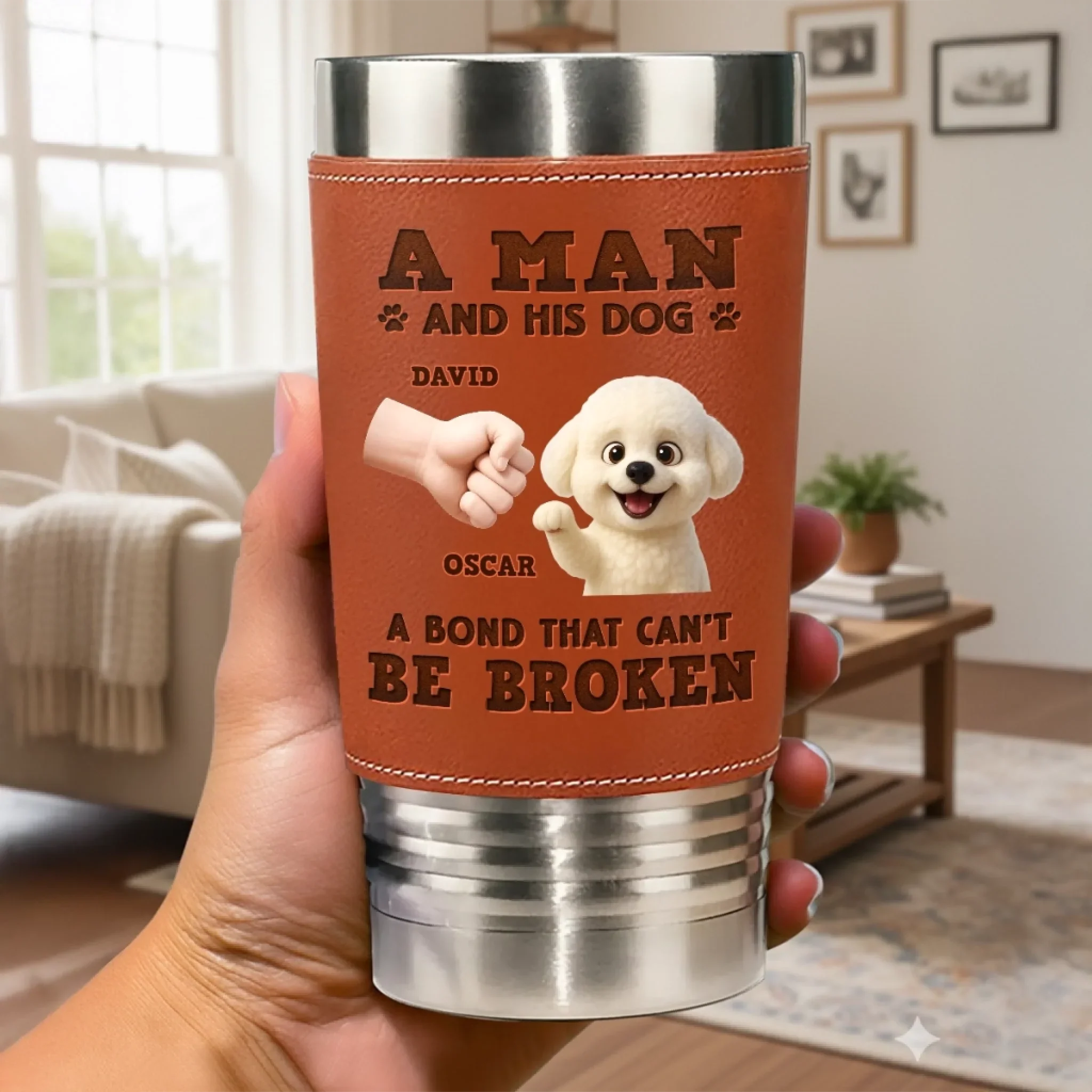 Custom Printed Leather Tumbler - Personalized Birthday Gifts For Dog Lovers, Dog Dad And Mom - Happiness Is A Wag